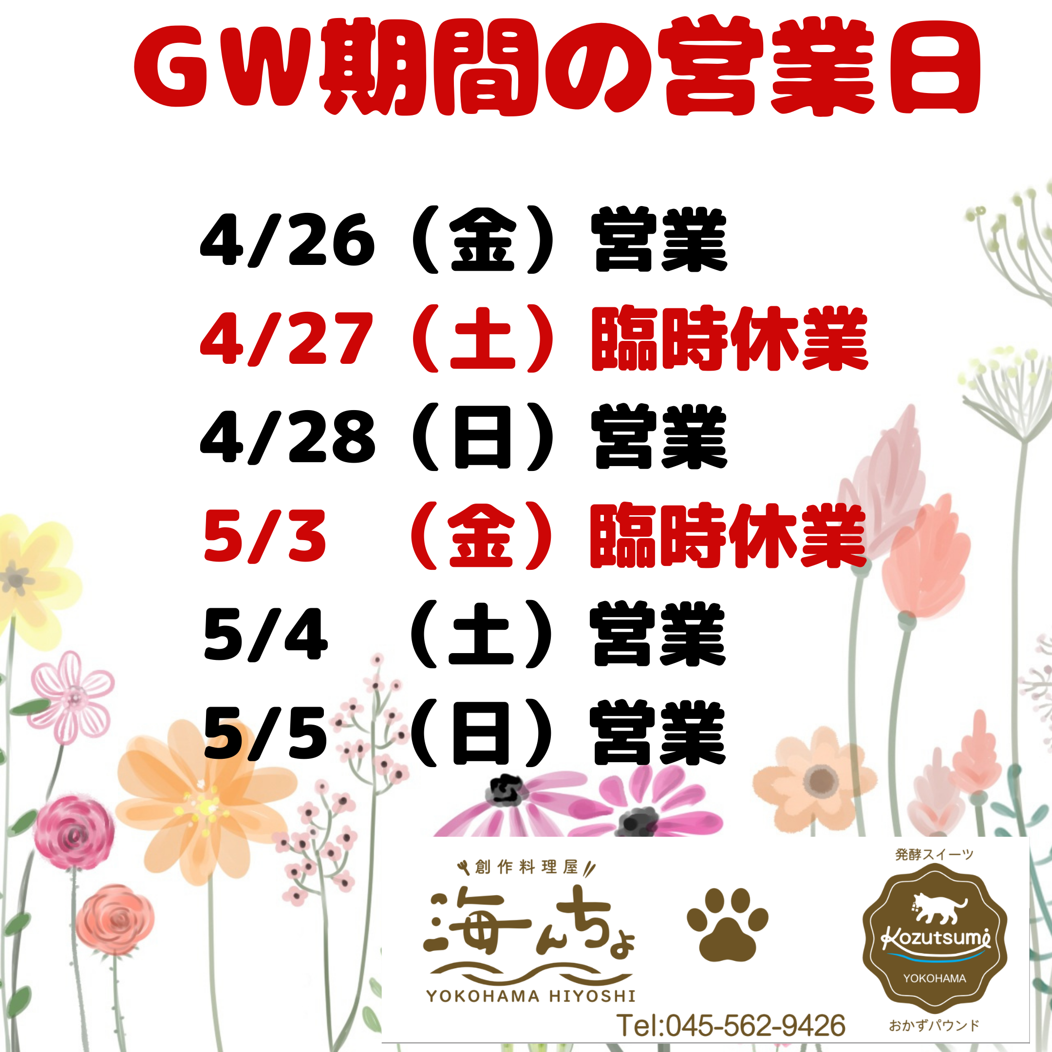 臨時休業のお知らせ|4/27(土)&5/3(金・祝)はお休みです